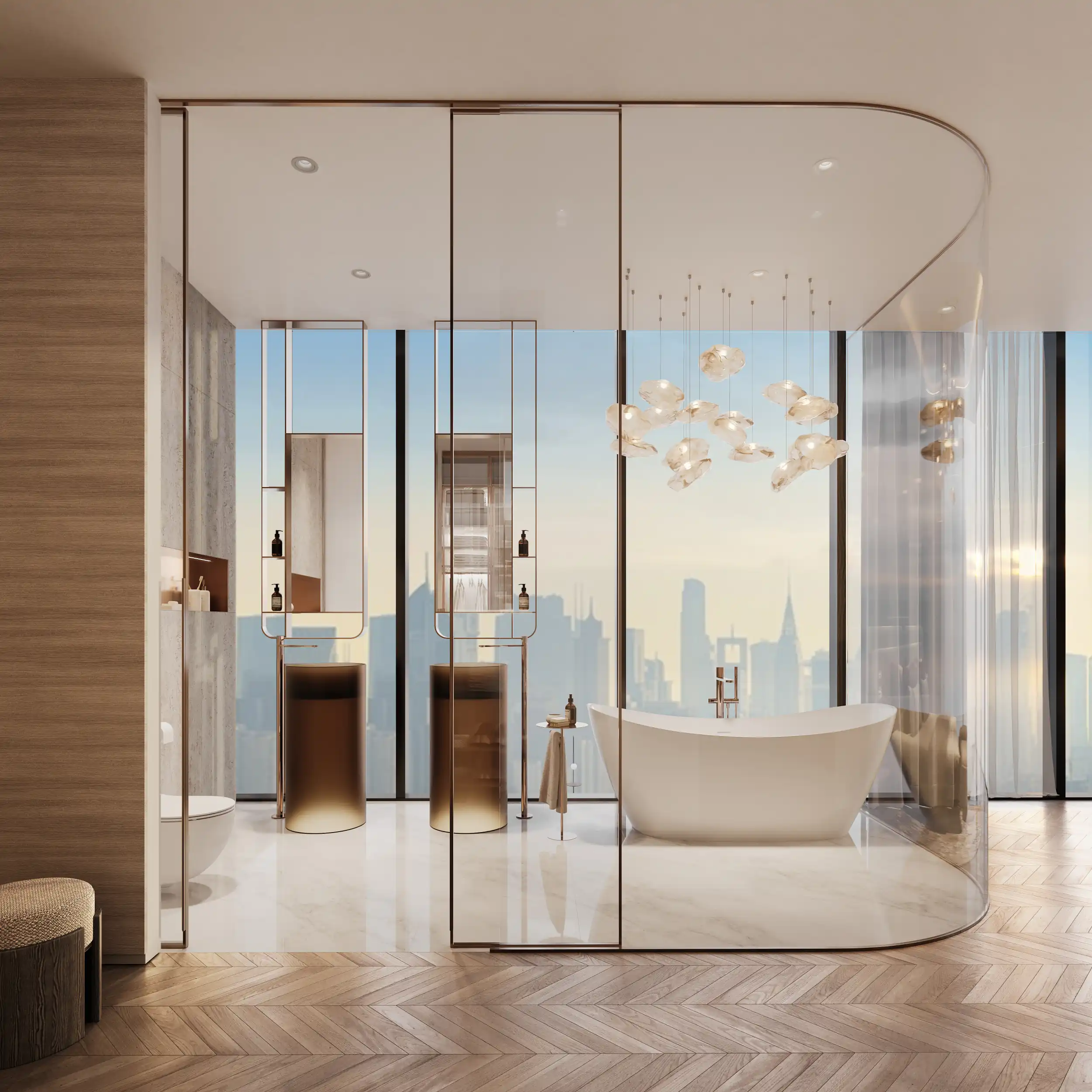 Chaque détail est pensé comme une expérience sensorielle : façades en verre réfléchissant, balcons fluides, volumes baignés de lumière naturelle. Dès le lobby à double hauteur, l’ambiance est posée : design épuré, textures soignées, lumière douce, arbres décoratifs… un avant-goût du luxe que l’on retrouve dans chaque appartement.